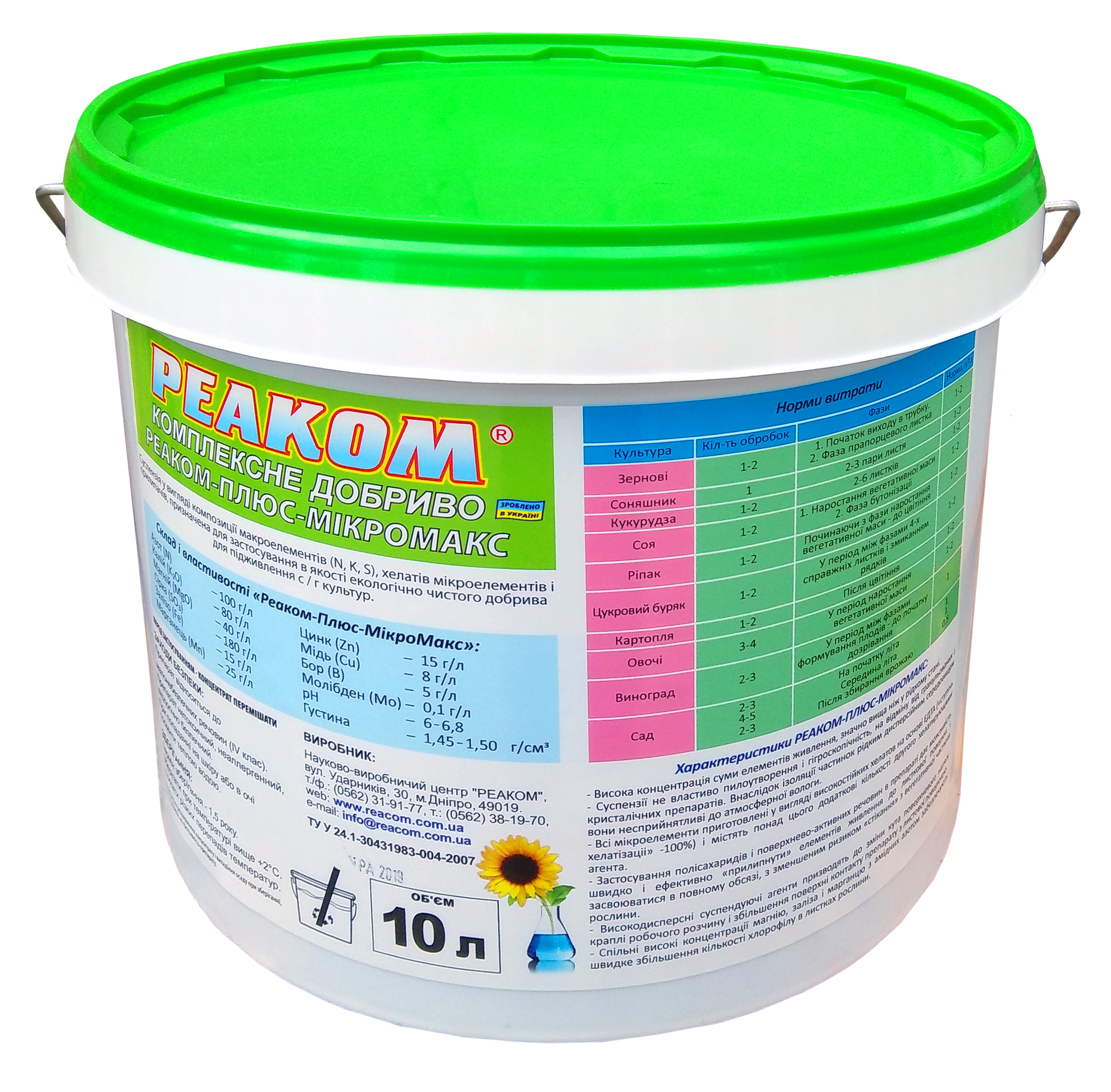Суспензія РЕАКОМ-ПЛЮС "МІКРОМАКС" у вигляді композиції макроелементів (N, К, S), хелатів мікроелементів і прилипачів, призначена для застосування в якості екологічно чистого добрива для підживлення широкого ряду с/г культур.