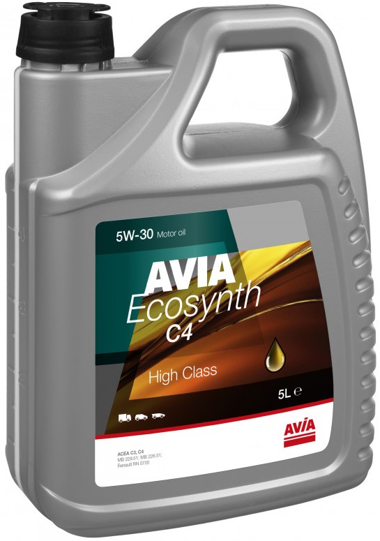 Avia Ecosynth C4 5W-30 - cинтетична моторна олива, що забезпечує економію пального, рекомендується використовувати в бензинових та дизельних двигунах, з турбонаддувом або без, в автомобілях та мікроавтобусах. Завдяки спеціальному складу, оливу можна використовувати у транспортних засобах, на які потрібна специфікація Renault RN 0720, обладнаних сучасними триходовими каталізаторами та фільтрами для твердих частинок. Завдяки низькому вмісту сульфатної золи (Low SAPS) забезпечується захист фільтра сажі дизеля і це допомагає продовжити термін його експлуатації.