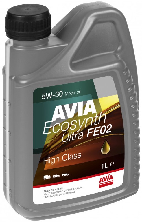 AVIA ECOSYNTH ULTRA FE02 5W-30 - високопродуктивна, легкотекуча моторна олива для всесезонного застосування в бензинових і дизельних двигунах, з наддувом і без нього, легкових автомобілів і вантажних автомобілів малої потужності (звертати увагу на інструкції по експлуатації!). Гарантує як хорошу здатність холодного запуску двигуна, так і високу стійкість до старіння і окислення при високих температурах. Завдяки збалансованому рівню в'язкості, використання ECOSYNTH ULTRA FE02 зменшує споживання палива в порівнянні з використанням звичайних моторних олив.