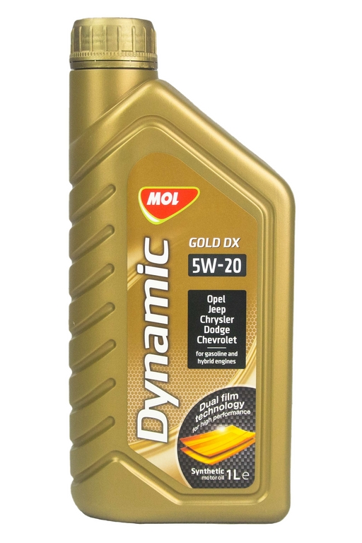 MOL Dynamic Gold DX 5W-20 - високоефективна, синтетична моторна олива. Виготовлена на основі технології плівки подвійної міцності, для легкових автомобілів і мікроавтобусів, обладнаних найсучаснішими бензиновими двигунами з турбонаддувом і безпосереднім уприскуванням палива. Повністю відповідає вимогам специфікації Chrysler MS-6395 і, насамперед, рекомендована для автомобілів Chrysler, Dodge і Jeep, вироблених після 2005.