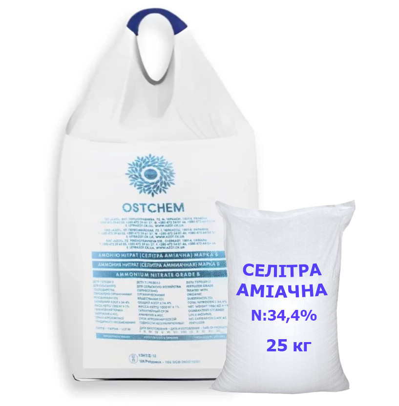 Селітра аміачна — універсальне азотне добриво з вмістом азоту 34,4% у двох формах: аміачній (повільне засвоєння) та нітратній (швидке засвоєння). Ідеально підходить для підживлення всіх сільськогосподарських культур.