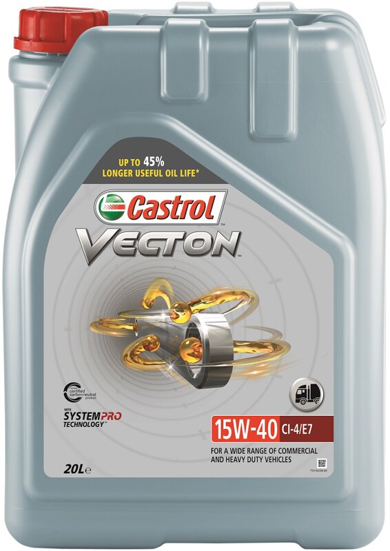 Castrol VECTON 15W-40 CI-4/E7 с технологией System Pro обеспечивает улучшение эксплуатационных характеристик масла вплоть до 45%, противостоит деградации смазочного материала, а также адаптируется к более высоким рабочим температурам для увеличения эффективного срока службы масла, что дает вам уверенность при его использовании с максимальными интервалами замены.