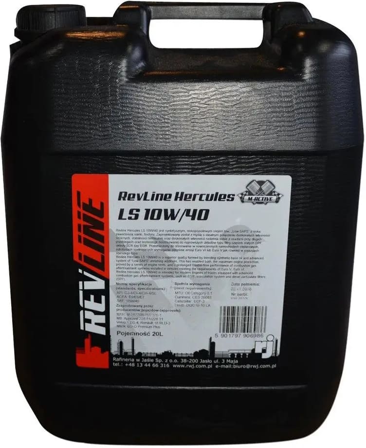 Revline Hercules LS 10W/40 синтетическое малозольное масло, т.н. Low SAPS с низким содержанием серы и фосфора. Была разработана для идеального сочетания отличных смазочных свойств, термической стабильности и отличных свойств для борьбы с отложениями при большом пробеге и технологии, адаптированной к новейшим системам, таким как сажи фильтры DPF, системы SCR или EGR. Предназначена для использования в современных грузовиках, автобусах, отвечающих требованиям выбросов Евро VI или Евро V, а также в транспортных средствах более старых типов.