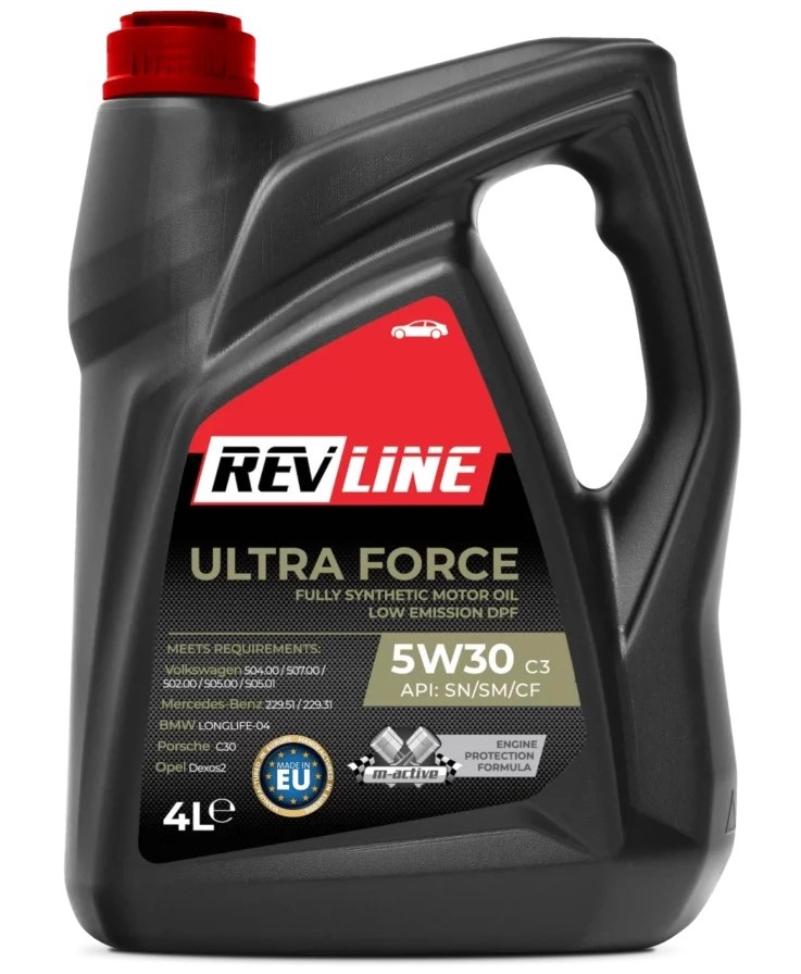 Revline Ultra Force C3 5W/30 высококачественное синтетическое моторное масло, предназначенное для использования в современных бензиновых и дизельных двигателях с низким уровнем выбросов в легковых автомобилях, внедорожниках и легких коммерческих автомобилях. Специальный состав масла обеспечивает длительный срок службы и отличную работу современных систем, снижающих выброс вредных компонентов в отработавших газах (например, фильтр сажи DPF).