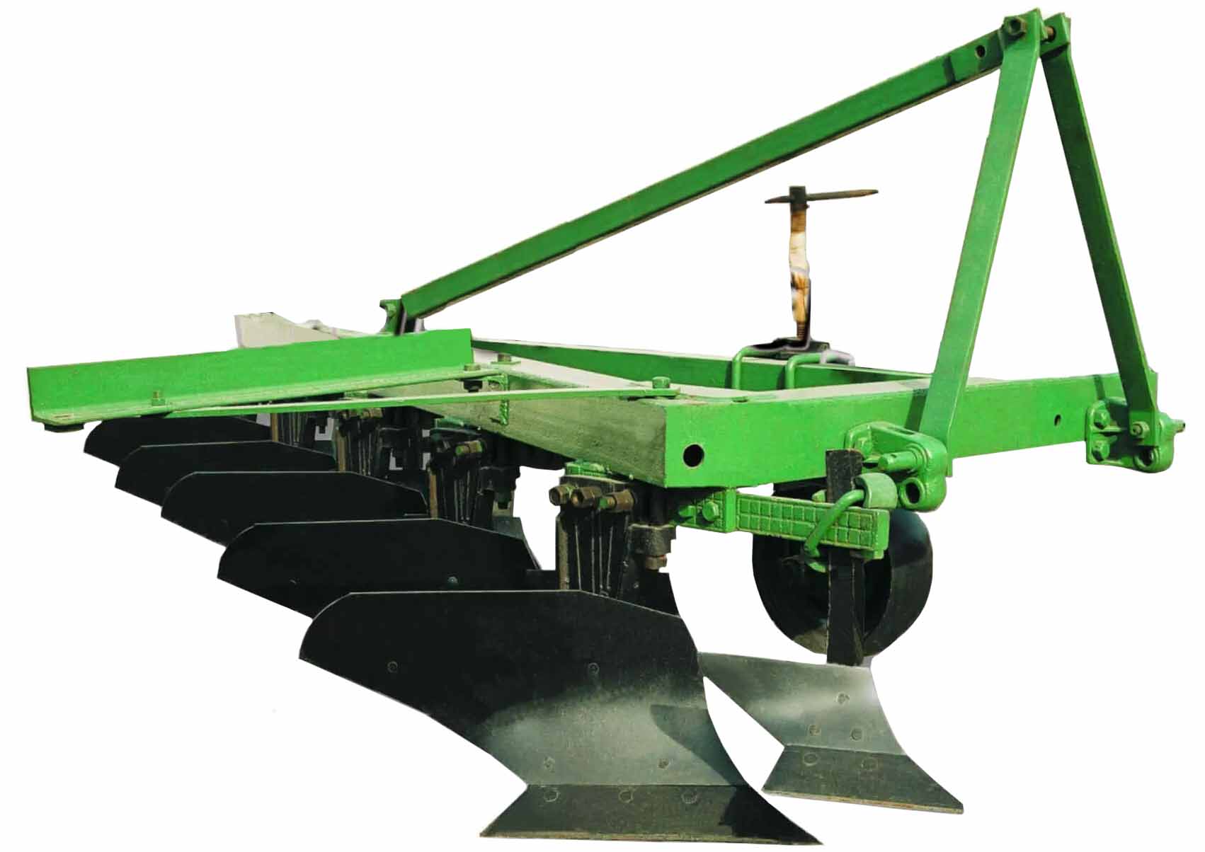 Наличие пяти основных рабочих корпусов и дополнительных элементов - предплужников, позволяет максимально эффективно применять отвальный плуг для осуществления глубокой заделки остатков сорняков и сельхозкультур. Глубина обработки регулируется, и для этой модели составляет 30 см, установка необходимой величины осуществляется винтовым механизмом, находящимся на стойке опорного колеса.