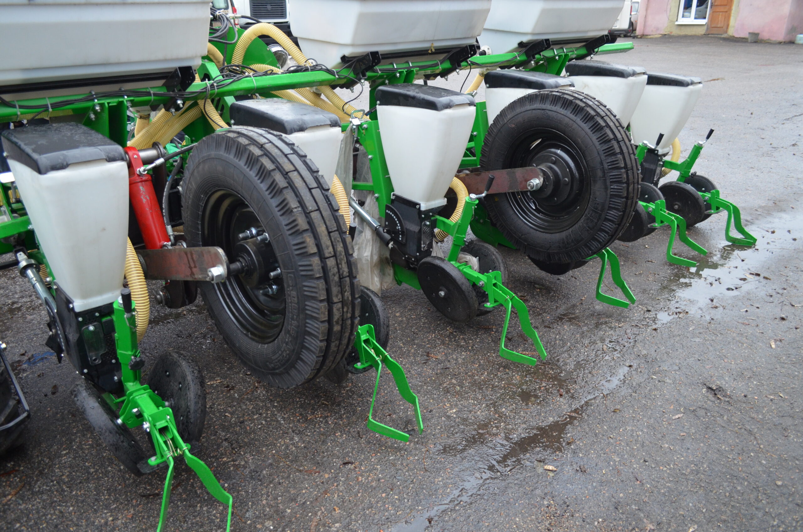 Транспортное устройство ПТС-7 используется для транспортировки импортных навесных пропашных сеялок SFOGGIA Gamma Plus, которые агрегатируются с тракторами мощностью от 80 л.с между полями, а также по дорогам общего пользования.
