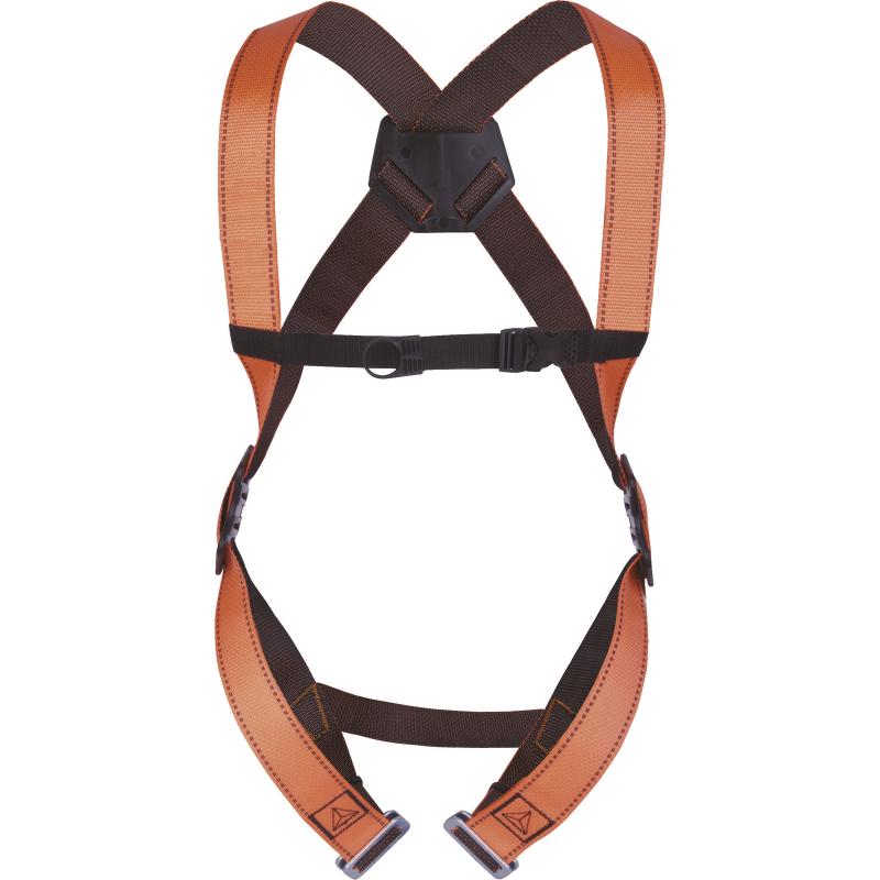 Привязь с 1 точкой крепления для защиты от падений сзади (на спине). Материал лямок – полиэстер. Регулировка привязи осуществляется с помощью 2 пряжек на ножных лямках, 2 регулировочных пластин по бокам и пряжки на грудной лямке. Испытана на 140 кг.