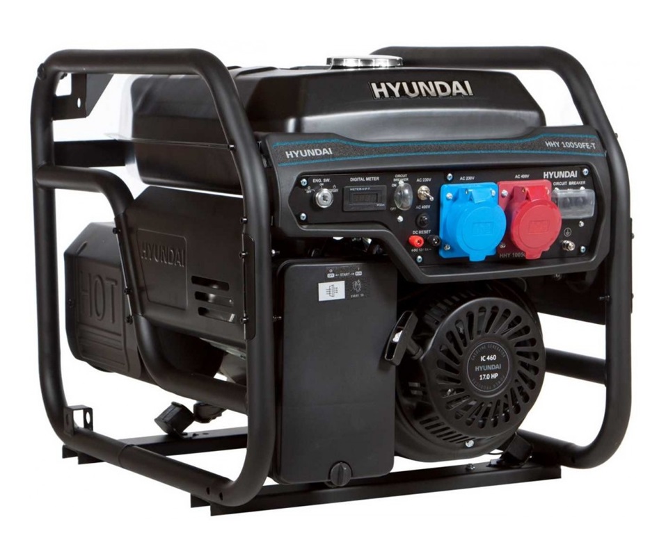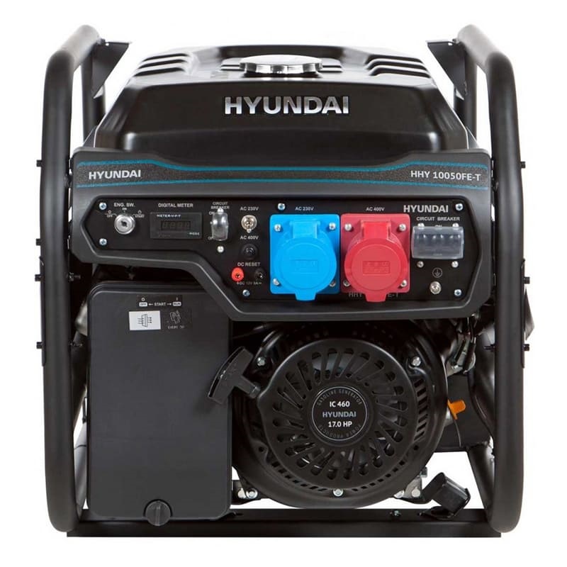 Hyundai HHY 10050FE-T - бензиновый генератор для обеспечения электроэнергии в жилых домах, на строительных объектах, для временного подключения электроприборов, электроинструментов, для которых необходимо напряжение 220В. Оснащен корейским двигателем Hyundai IC 460 с мощностью 18 л.с., который обеспечивает высокий моторесурс генератора и долгий срок службы за счет защиты от перегрева и перегрузки.