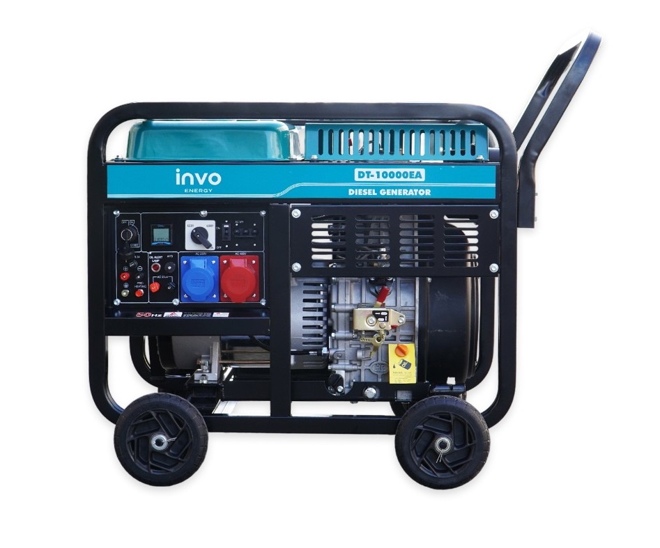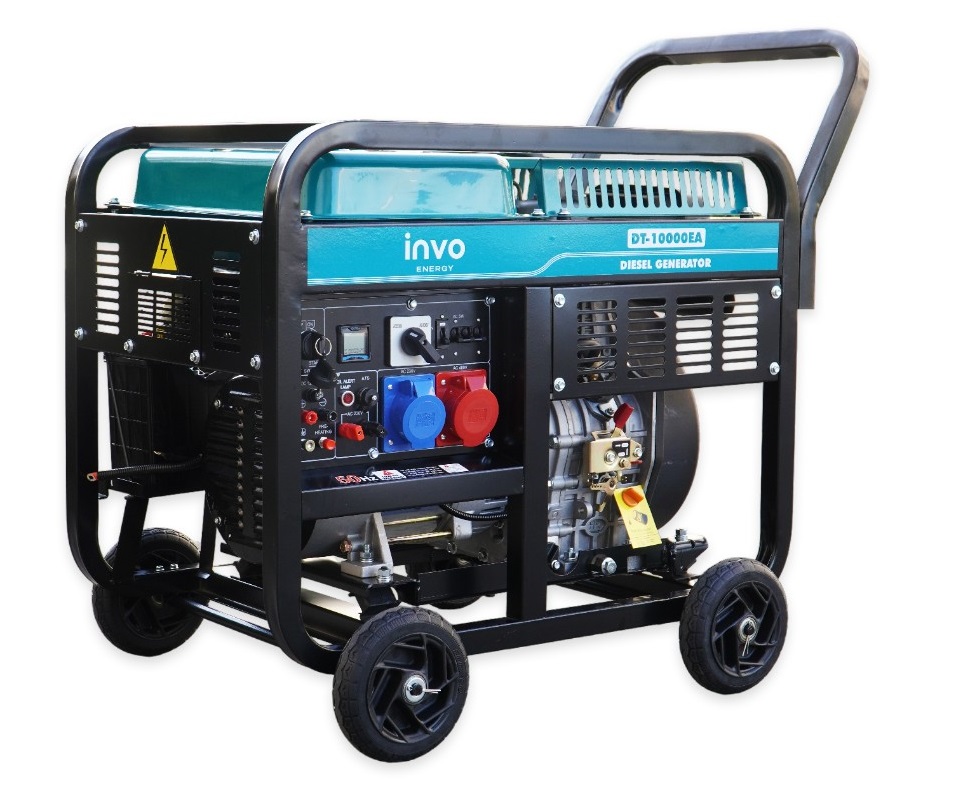 Дизельный генератор INVO DT-10000EA - дизельный генератор с электронным датчиком наработки моточасов, со световым индикатором уровня масла, на колесах для бытового и промышленного класса с выходным напряжением 230/380 В, с медной обмоткой, предназначенный для обеспечения электропитанием . магазинов, государственных учреждений. Данная модель генератора имеет номинальную мощность 7,6/9 кВт, чего достаточно для питания электроприборов и оборудования в небольшом здании, а большой бак для топлива на 25 л обеспечит бесперебойную работу до 12 часов при 75% нагрузке.