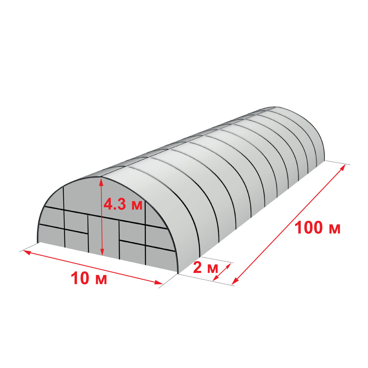 Теплиця 10 на 100 метрів — це професійна конструкція для великих фермерських господарств і промислових тепличних комплексів. Каркас виготовлений із оцинкованої круглої труби Ø57 мм (товщина стінки 1,4 мм), що гарантує надзвичайну міцність, стійкість до снігових і вітрових навантажень та довговічність понад 10 років. Завдяки висоті 4,3 м теплиця забезпечує комфортну робочу зону для вирощування будь-яких культур — від овочів до зелені й розсади.