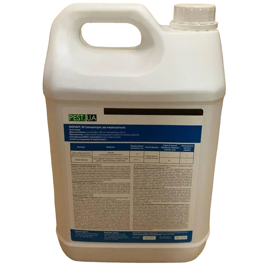 Свойства: Форинт обладает широким спектром инсектицидного действия, уничтожает комплекс сосущих и грызущих насекомых, живущих открыто, ограничивает развитие растительноядных клещей. При соблюдении регламентов применение не выявляет фитотоксичности. Совместим с другими инсектицидами, акарицидами, фунгицидами, водные растворы которых имеют нейтральную реакцию. Не фитотоксичен для возделываемых культур при соблюдении регламентов применения. Токсичен для пчел. Запрещается опрыскивание в фазу цветения. Применение к цветению не ограничивается, поскольку препарат не проникает в нектар и пыльцу цветов. Инсектицид быстро проникает в кутикулу листьев и плодов, поэтому через 2 часа после его внесения осадки или сильная роса не снижают эффективность препарата.