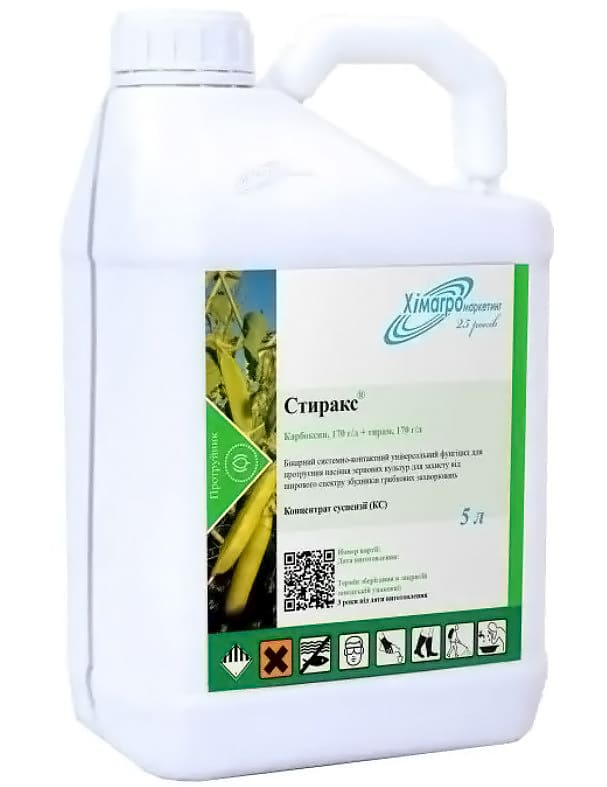 Механизм действия: стиракс подавляет развитие фитопатогенов, которые находятся как на поверхности, так и внутри семян. Благодаря передвижению к точкам роста препарат защищает всходы и корневую систему растений от заражения почвенными патогенами. Системное действующее вещество карбоксин отличается высокими фунгицидными свойствами по отношению к возбудителям головневых болезней, благодаря активному блокированию ферментативного комплекса митохондрий клеток фитопатогенных грибных организмов. Контактное действующее вещество тирам имеет высокий эффект ограничения развития возбудителя плесени и загнивания всходов, корневых и стеблевых гнилей.