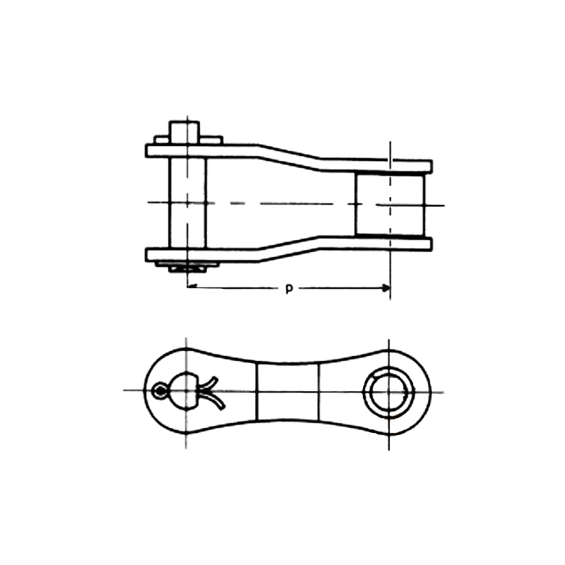 Звено переходное П-ТРД-38,4 служит для соединения отрезков транспортерной роликовой длиннозвенной цепи ТРД-38,4, состоящих из четного количества звеньев.