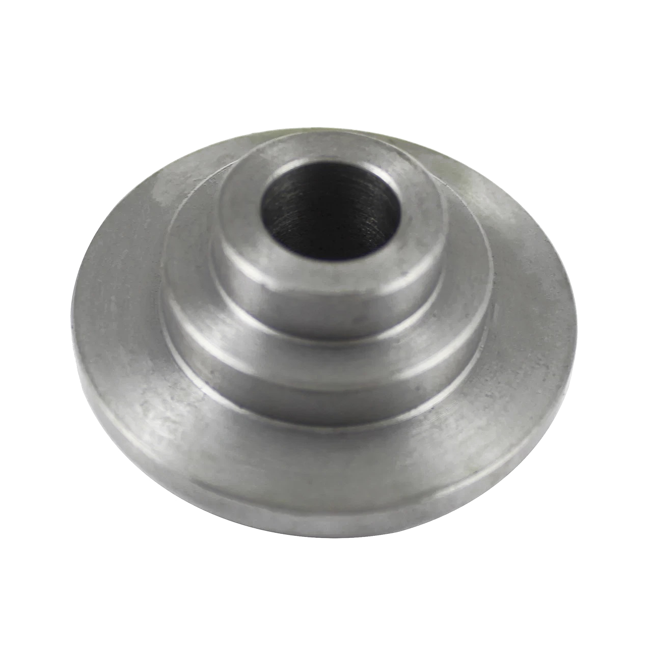 Точеная стальная деталь в виде ступенчатого цилиндра с центральным отверстием. Поверхность детали оцинкована.