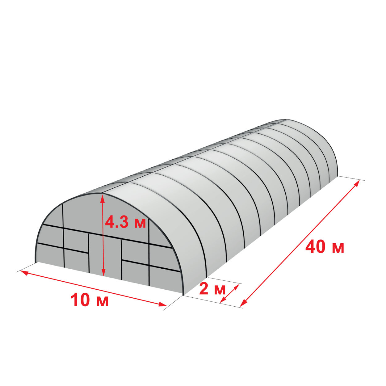 Каркас теплиці 10 на 40 метрів — професійне рішення для промислового вирощування овочів, зелені, ягід і розсади. Конструкція виконана з оцинкованої круглої труби Ø57 мм (стінка 1,4 мм), що гарантує високу жорсткість, довговічність і захист від корозії. Висота 4,3 м та арочна форма забезпечують якісну вентиляцію, стік снігу та стабільний мікроклімат упродовж сезону. Каркас постачається без плівки — ви обираєте покриття під свої задачі (одно- чи двошарова плівка, армована тощо).