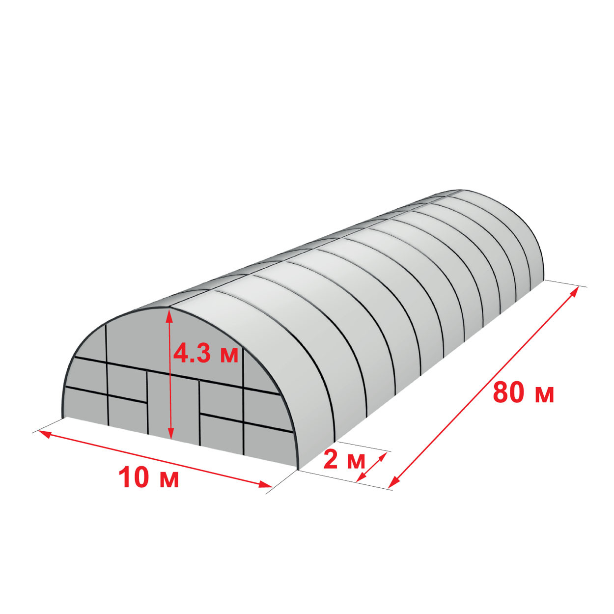 Теплиця 10 на 80 метрів — це промислова конструкція великої площі, розроблена для інтенсивного вирощування овочів, зелені, розсади, ягід і квітів протягом усього року. Каркас виготовлений із оцинкованої круглої труби Ø57 мм (товщина стінки 1,4 мм), що забезпечує надійність, стійкість до корозії та довговічність понад 10 років. Арочна форма витримує значні снігові й вітрові навантаження, а висота 4,3 м дозволяє використовувати механізоване обладнання.