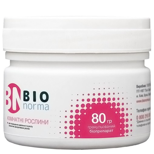 Біопрепарат BioNorma Кімнатні рослини (гранули) розроблений для активного живлення, стимуляції росту та ефективного захисту квіткових і декоративних рослин, вирощуваних у закритому ґрунті, контейнерах, горщиках або на присадибній ділянці. Застосовується при підживленні, садінні чи пересадці, оптимізуючи формування кореневої системи й стійкість до фітопатогенних мікроорганізмів.