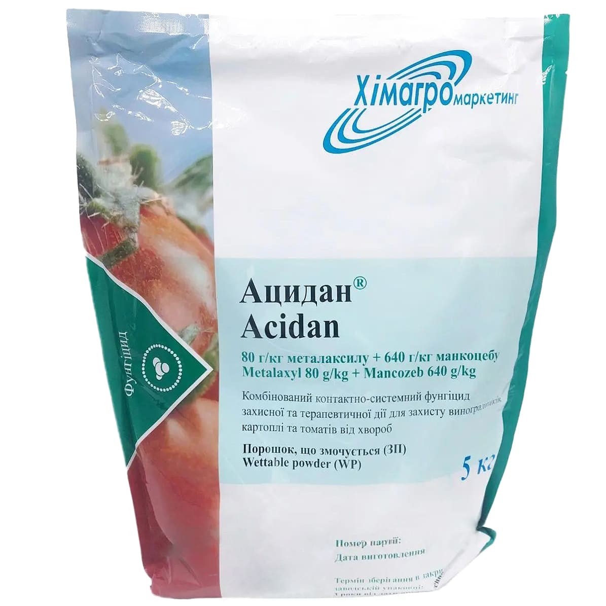 Хімагромаркетинг Ацидан — це високоефективний контактно-системний фунгіцид профілактичної та лікувальної дії для захисту винограду, картоплі, томатів, огірків, цибулі та інших сільськогосподарських культур від широкого спектру грибкових захворювань. Комбінація двох діючих речовин гарантує надійний захист та зменшує ризик розвитку резистентності у збудників хвороб.