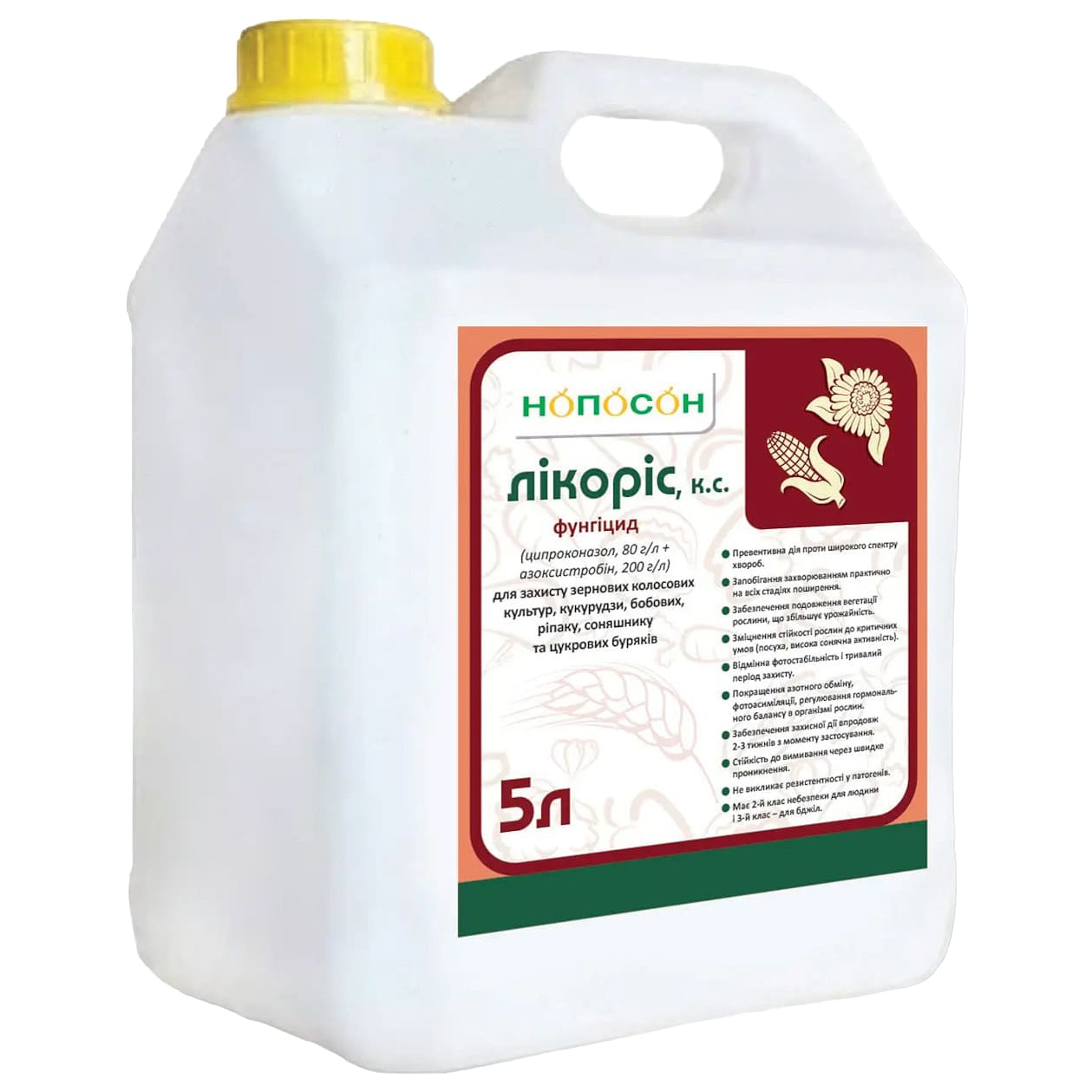 Нопосон Лікоріс — сучасний системний двокомпонентний фунгіцид для надійного захисту зернових колосових, кукурудзи, бобових, соняшнику, ріпаку та цукрових буряків. Препарат вирізняється широким спектром дії, пролонгованим ефектом та здатністю покращувати стійкість рослин до стресових факторів.