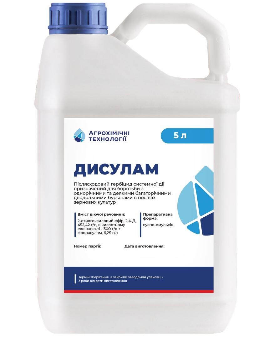 Гербіцид АХТ Дисулам – сучасний системний післясходовий гербіцид для ефективного контролю однорічних і багаторічних дводольних бур'янів. Завдяки унікальному поєднанню двох діючих речовин демонструє високу біологічну активність та забезпечує надійний захист посівів пшениці (ярої та озимої), ячменю, жита, кукурудзи, сорго та проса. Дисулам ідеально підходить для господарств, що прагнуть максимізувати врожайність та зберегти чистоту поля.