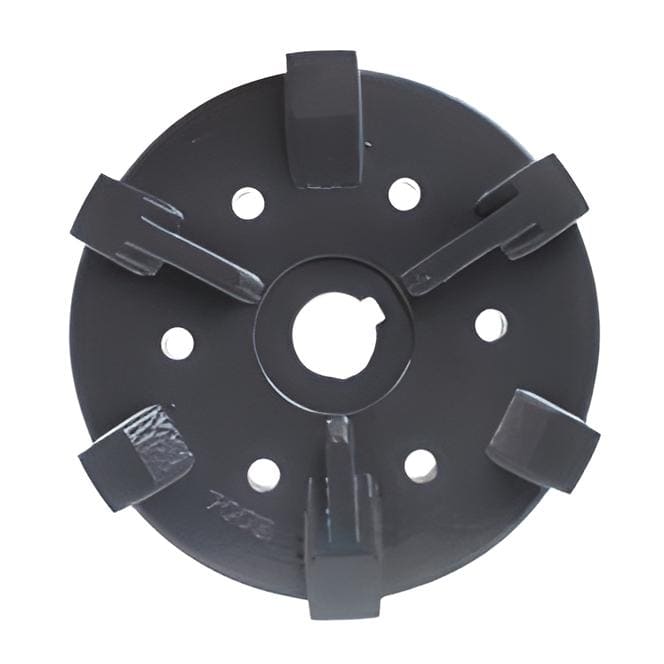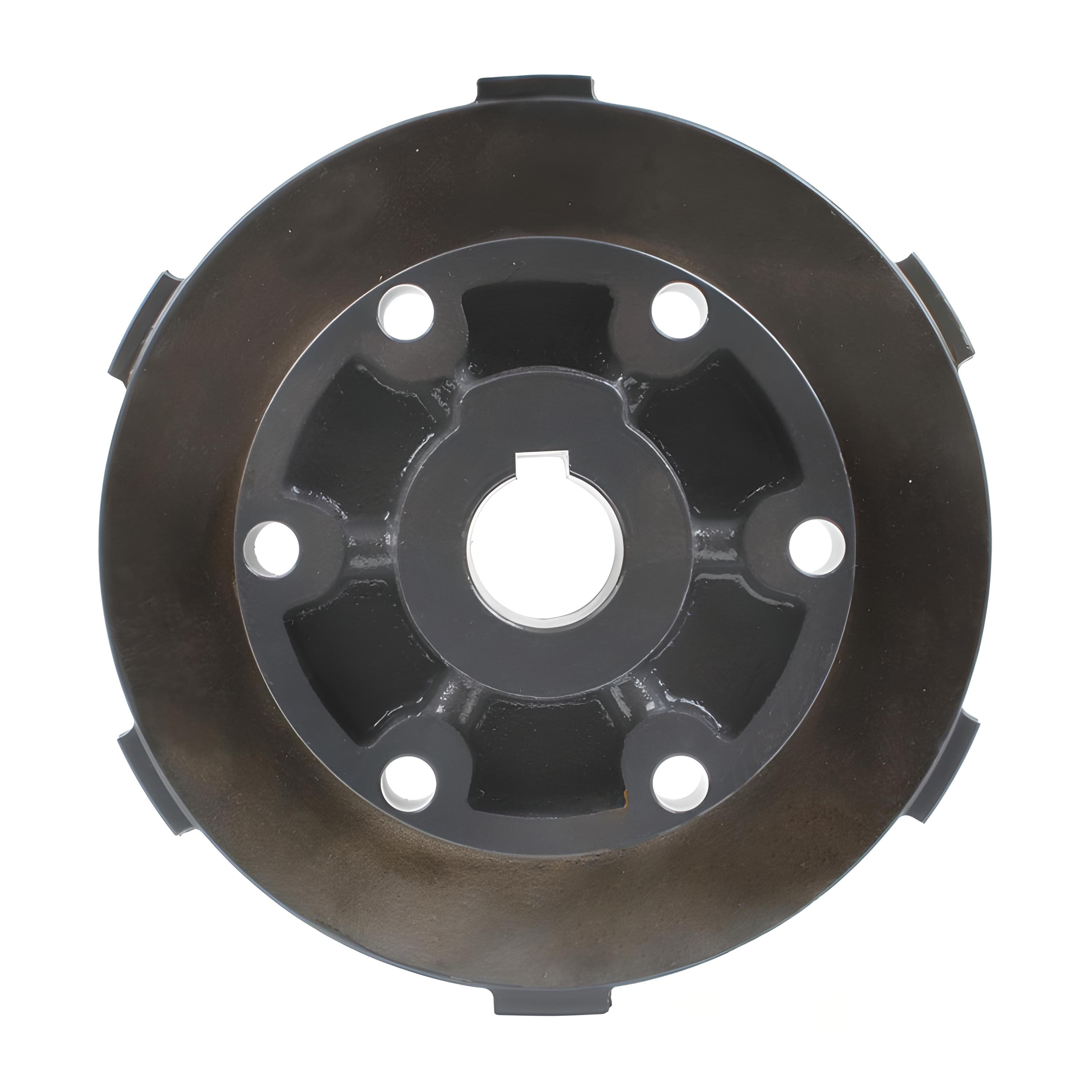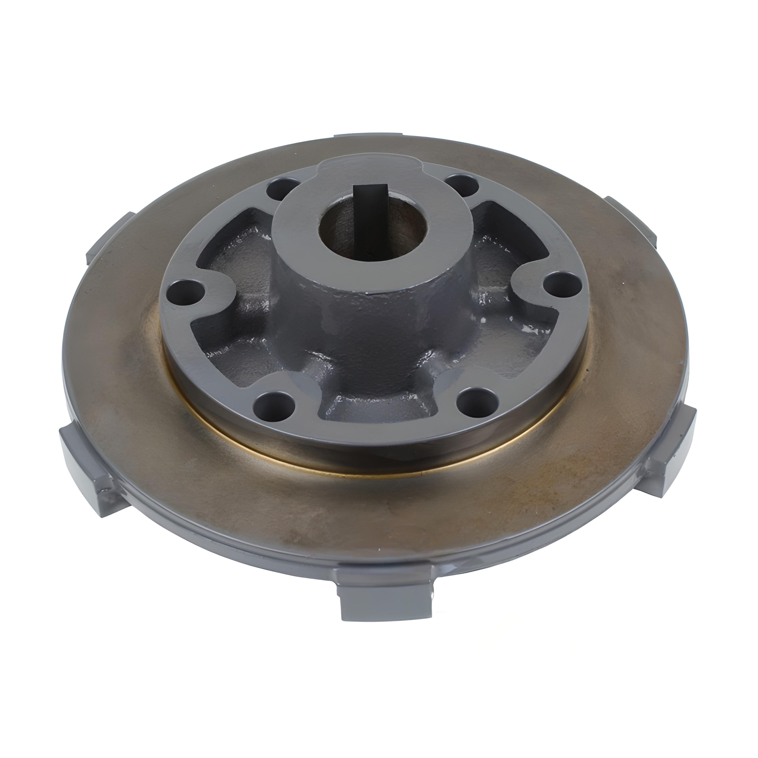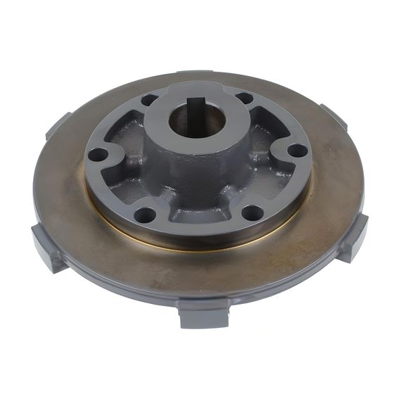 Сталева деталь складної просторової форми з отворами для кріплення і центральним отвором зі шпонковим пазом. Частина поверхні пофарбована.