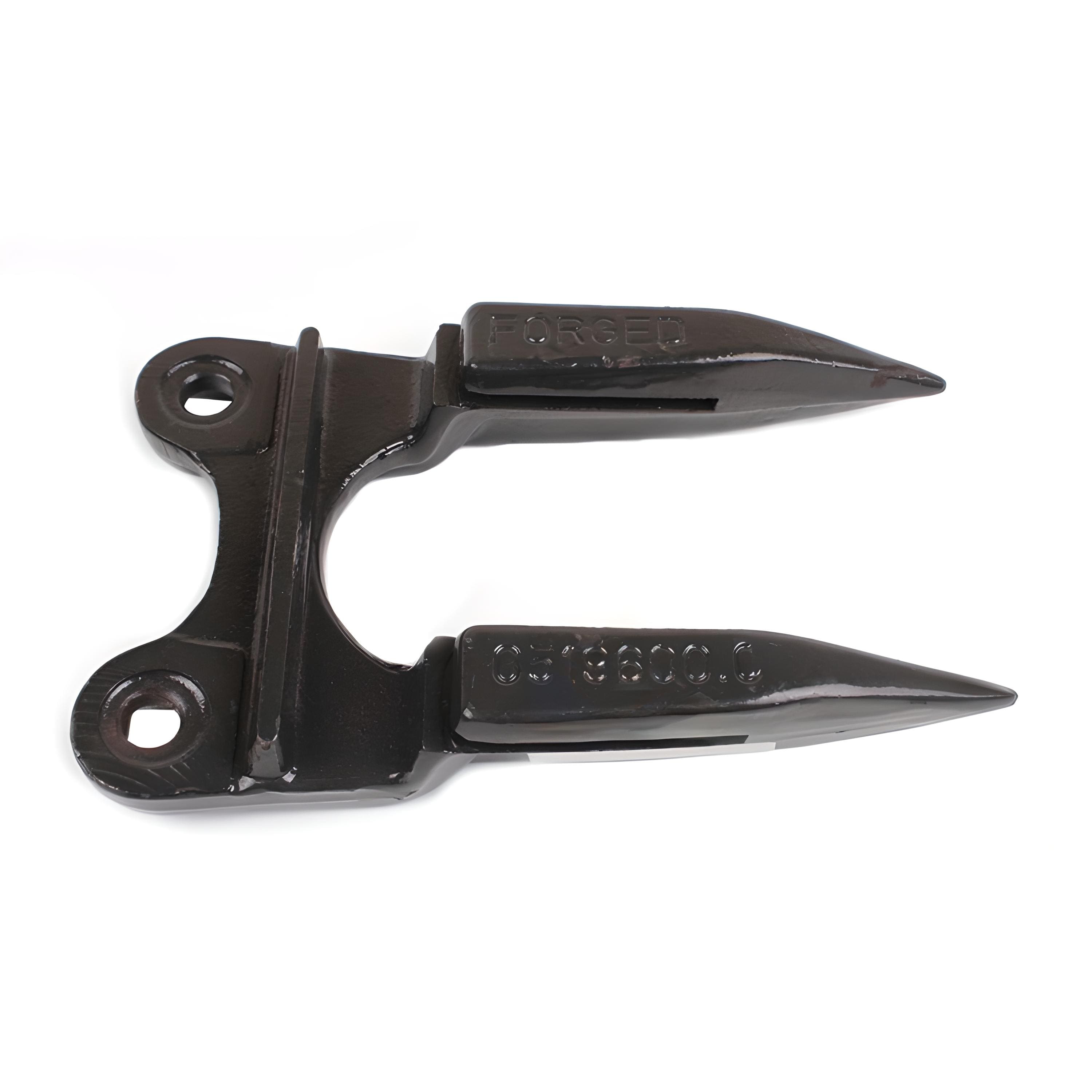 Кована сталева деталь складної просторової форми у вигляді двозуба. Біля основи головки виготовлені 2 отвори для кріплення до пальцевого бруса.