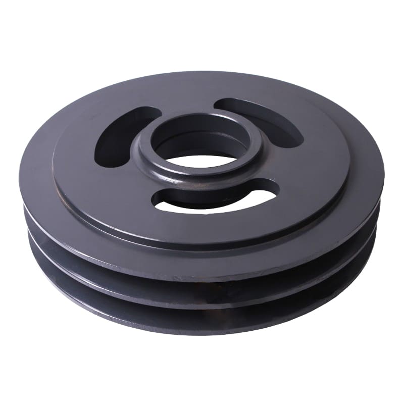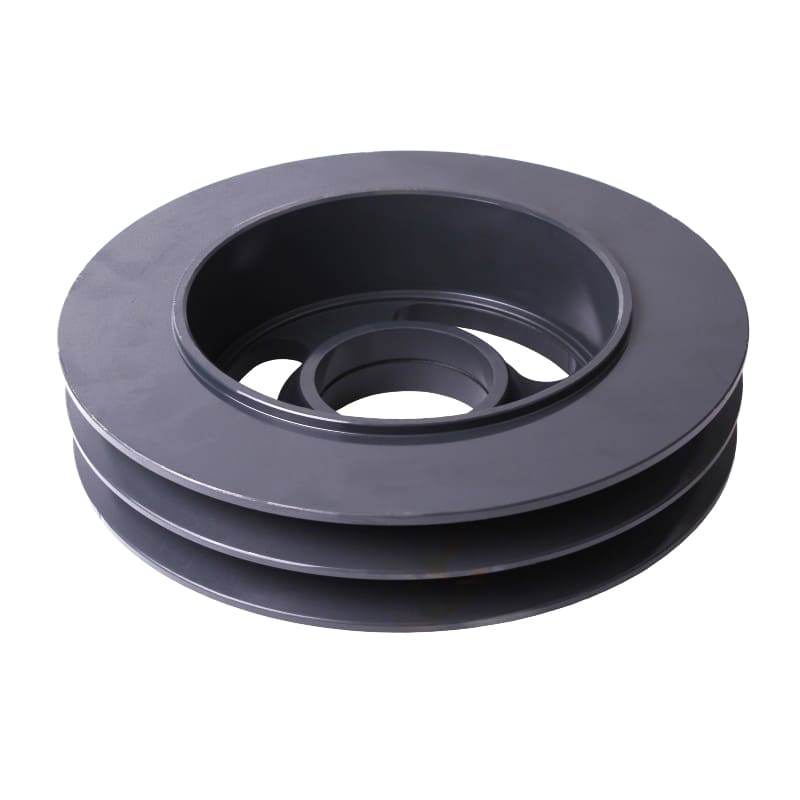 Виріб складної просторової форми з однією або кількома клиноподібними канавками на боковій поверхні (для встановлення ременів) та елементами кріплення у центральному отворі.